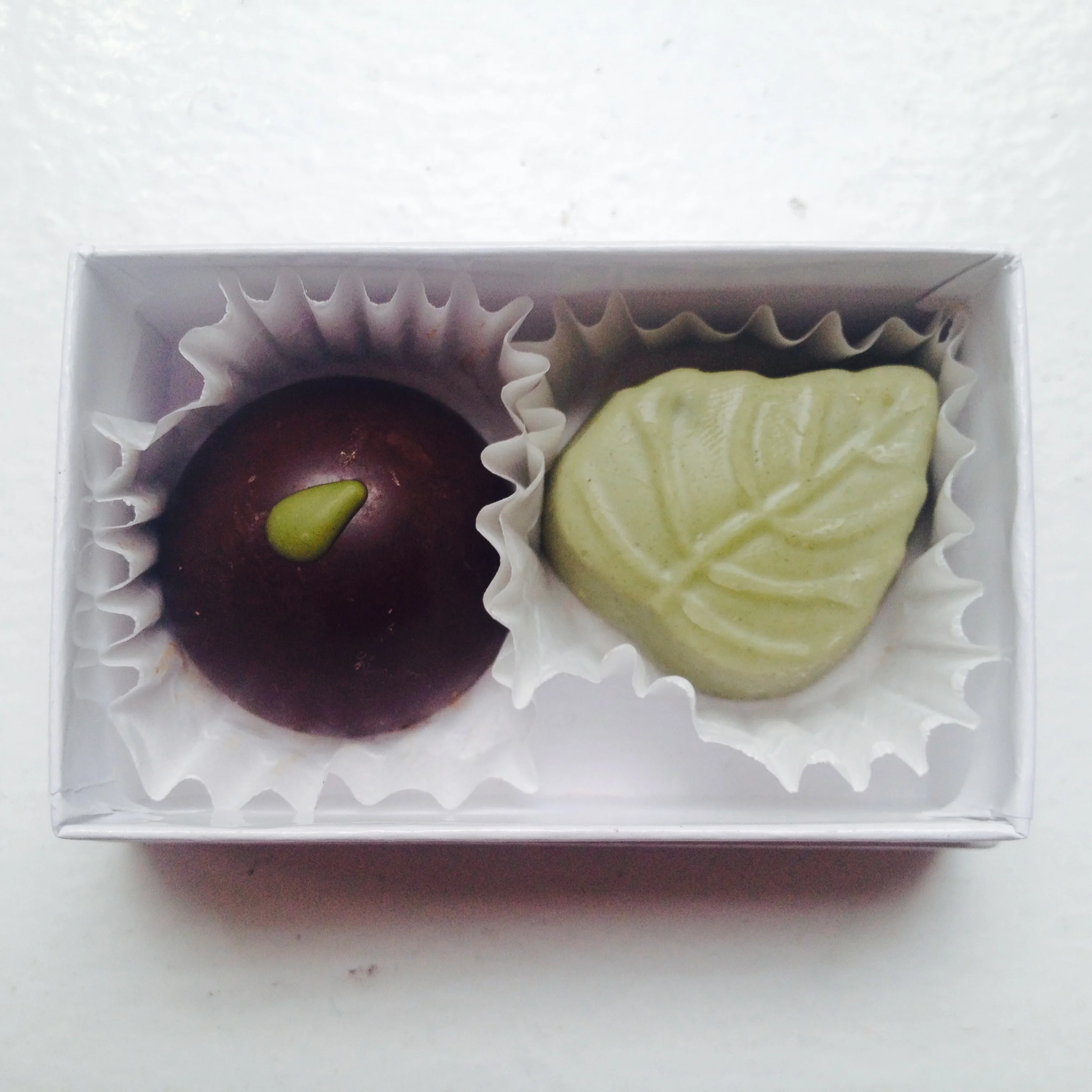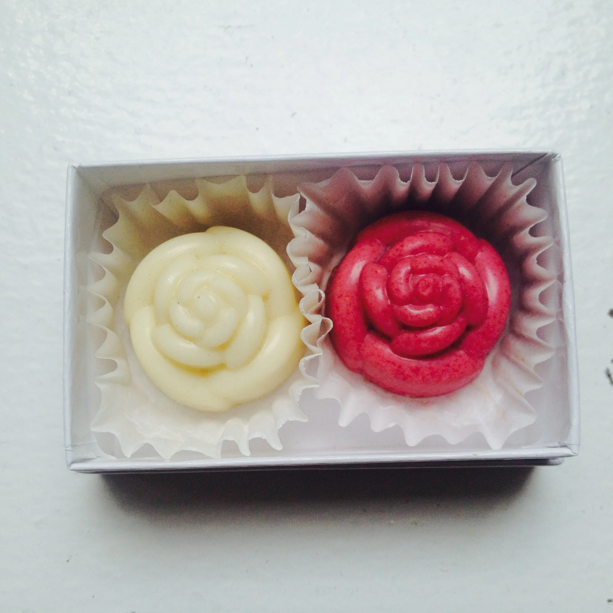 Lemon saffron truffle paired with lychee rosé truffle