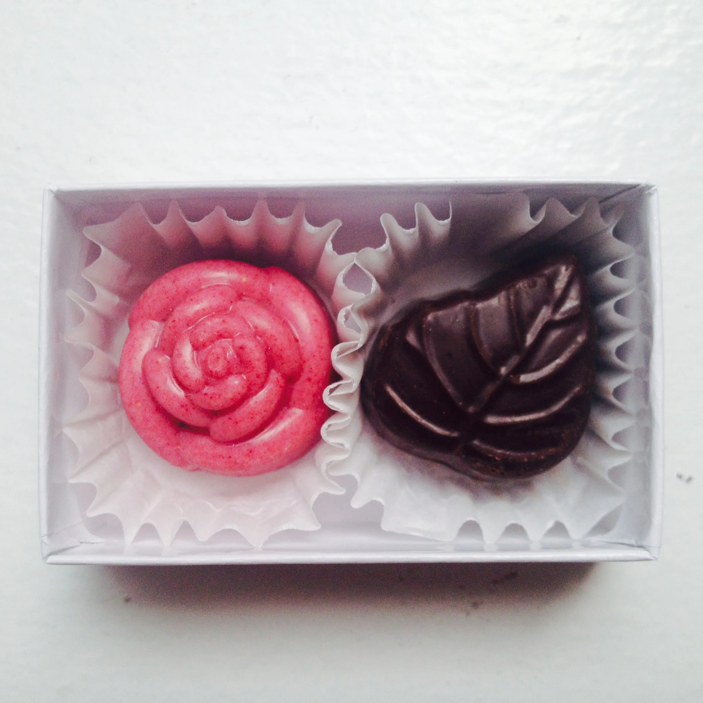 Two heart truffles with strawberry and bubbly paired with milk & lavender